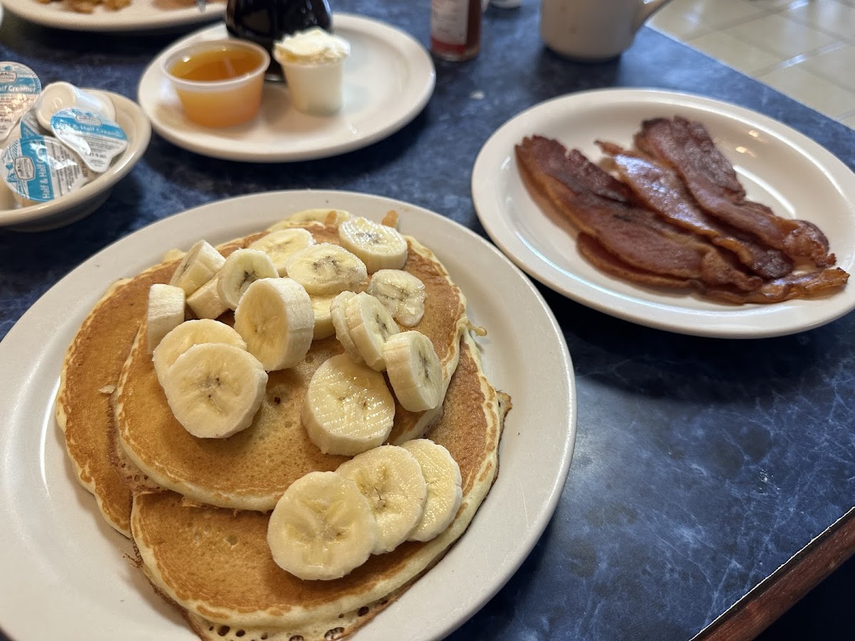 Delicious food and service was quick and efficient!! Bacon was great! Pancakes were included with my vegetarian omelet!! Waiter was very friendly! We will return!!