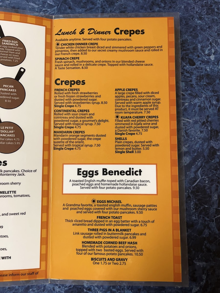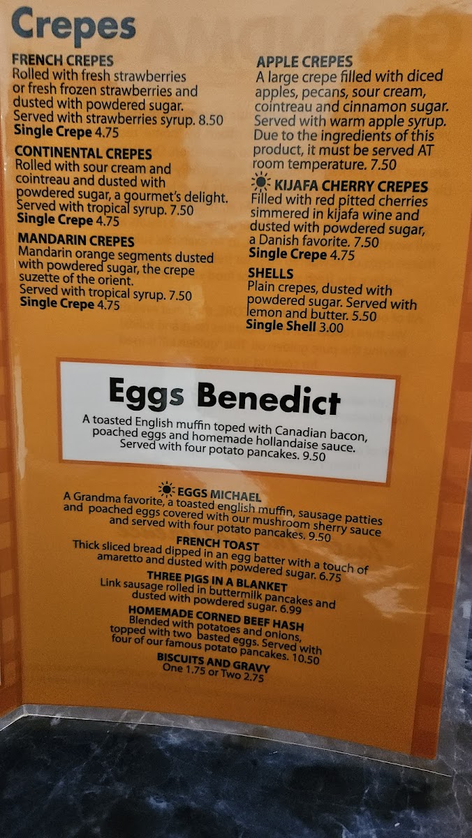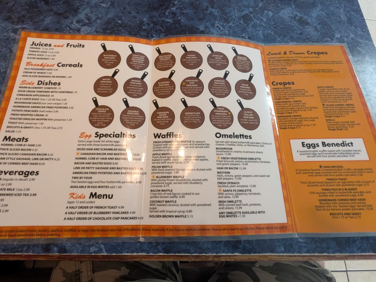 This menu suits the casual, unpretentious vibe of the restaurant, where good food and steady service help create a low-key, inviting experience. Whether you’re craving something hearty like a gigantic omelet or prefer lighter options like continental crepes, the choices feel grounded and familiar, ideal for those everyday moments.