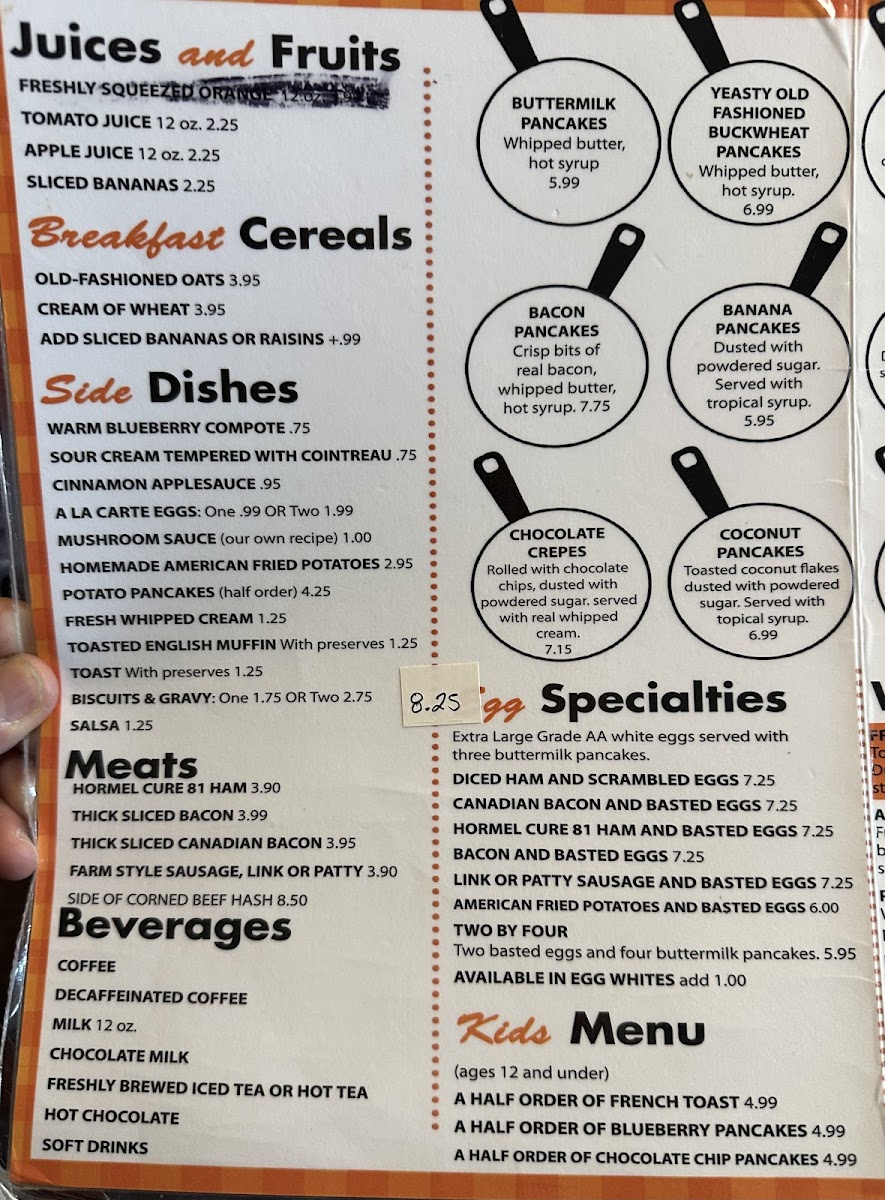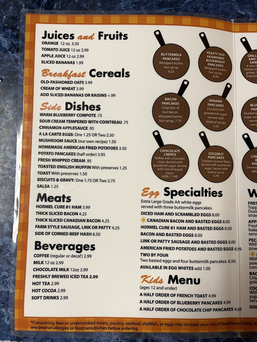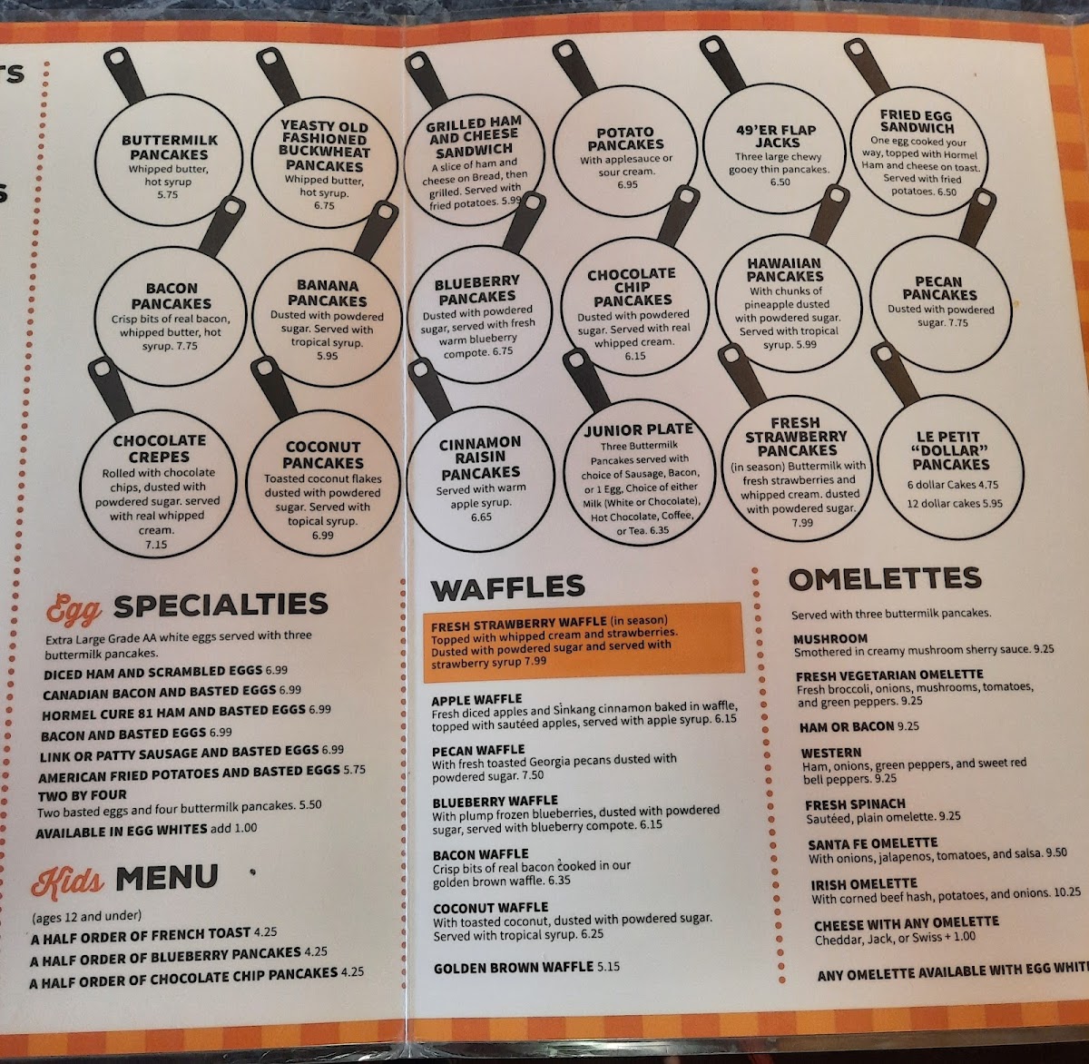 This menu suits the casual, unpretentious vibe of the restaurant, where good food and steady service help create a low-key, inviting experience. Whether you’re craving something hearty like a gigantic omelet or prefer lighter options like continental crepes, the choices feel grounded and familiar, ideal for those everyday moments.